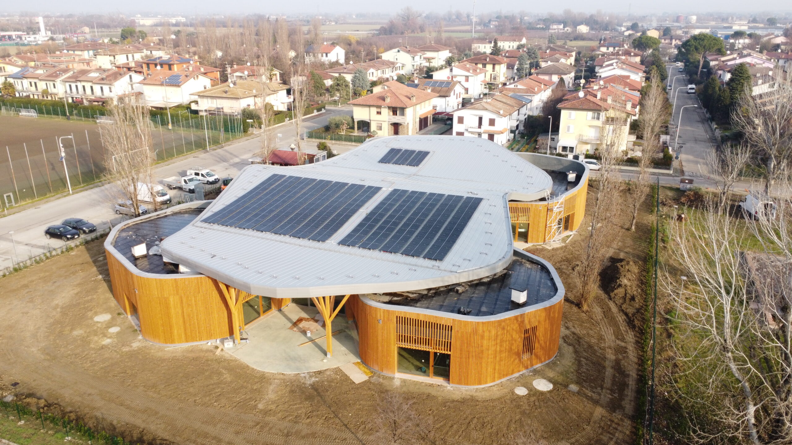 - Struttura: Legno lamellare con copertura metallica e tetto verde